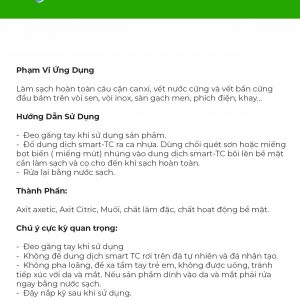 *Thành phần CHẤT TẨY SẠCH VÒI TẮM VÀ INOX SMART TC : axetic, citric, muối, chất làm đặc.